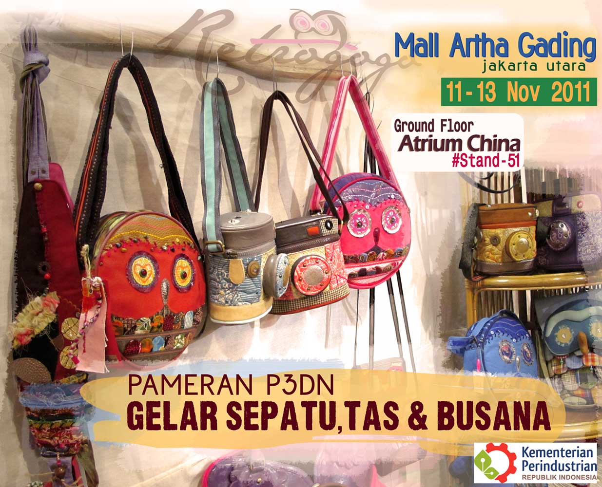 | Retrogogo Bags buka stand di Pameran P3DN Gelar Sepatu,Tas dan Busana Produk Indonesia , Mall Artha Gading 11-13 Nov'2011 - Lantai Dasar 'Atrium China' #stand,51 -- be there! https://www.facebook.com/pages/ANE-BAG/83448901029 |